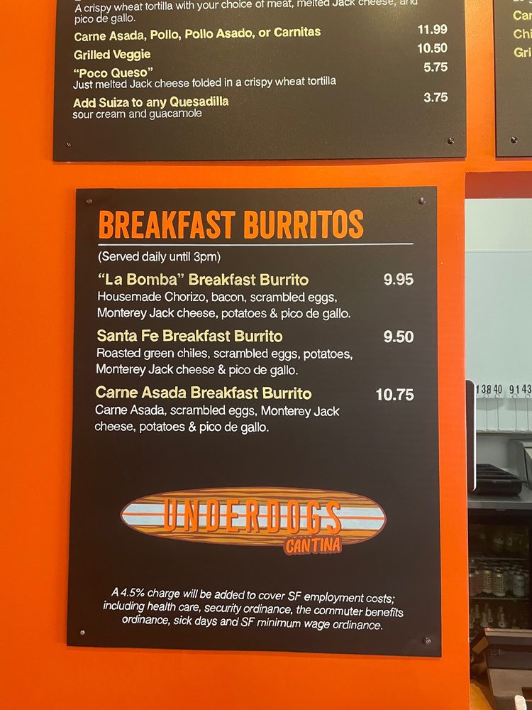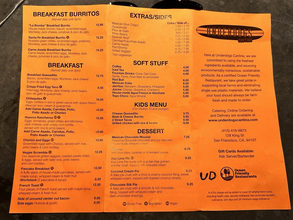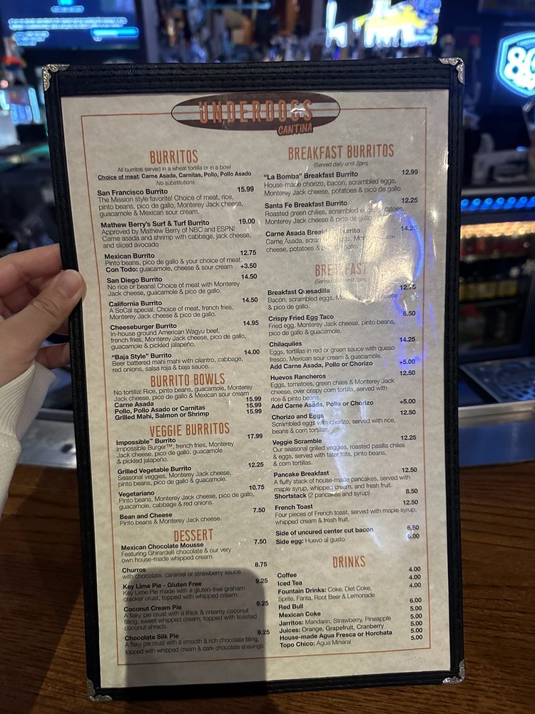 Introducing the menu at Underdogs Cantina brings a vibrant mix of Mexican flavors and a lively atmosphere. Located at 128 King St in San Francisco, this casual spot offers a range of delicious options for breakfast, including the signature La Bomba Burrito and Santa Fe Burrito. The beverage selection is equally enticing, featuring Mexican Coke, Horchata, Jarritos flavors, and more.