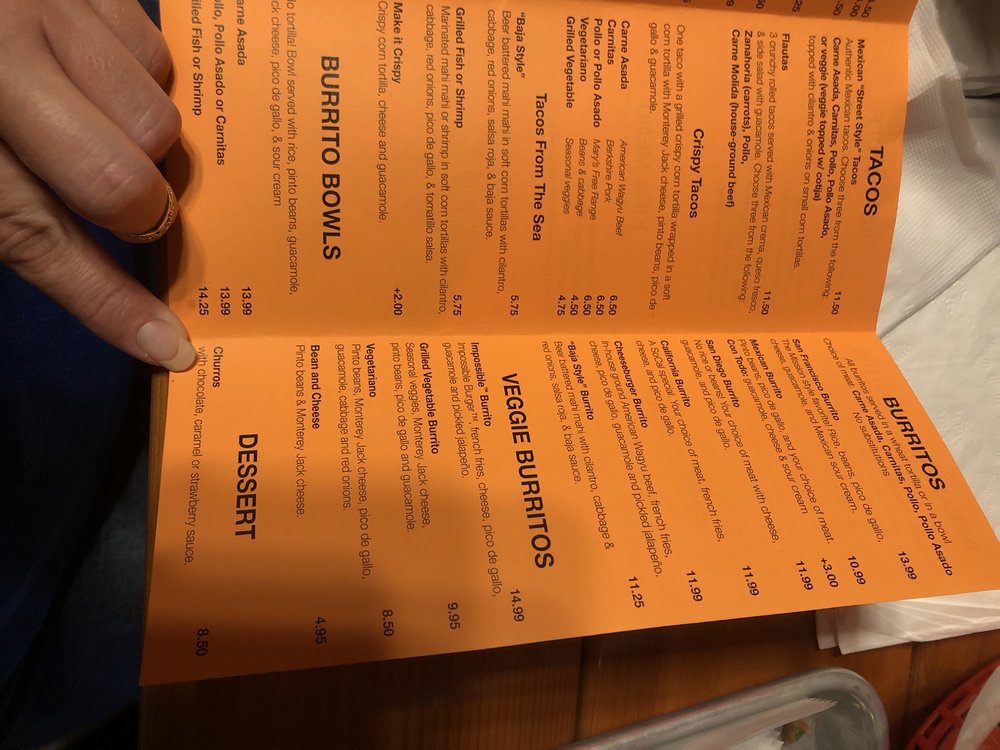 Beer-battered fish in a crispy tortilla wrapped in a soft tortilla. With Jack cheese, guacamole, cilantro, cabbage, red onions, salsa roja, & baja sauce (tangy aioli)